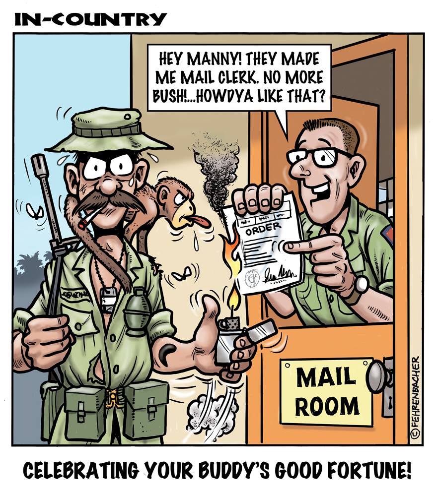 Phil enlisted in the Army in 1965 where he served for years in Vietnam. He became a graphic designer and has worked for the state of Oregon for 26 years. He retired in 2003 and started the Cartoon "In-Country". The cartoons reflect his experiences during his tour of duty in South Vietnam.